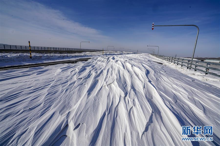 1月15日,在新疆玛依塔斯风区内,大风将白雪吹到公路上。 玛依塔斯风区位于新疆西北部额敏县境内。这里东西风交替频繁,一年大风天数超过150天,是世界上罕见的暴风雪灾害地段。驻守在这里的新疆塔城公路管理局额敏分局玛依塔斯应急保障基地,近年来连续装备抛雪机等冰雪抢险救灾装备,有力地保障了这条道路的交通安全。 新华社记者赵戈摄