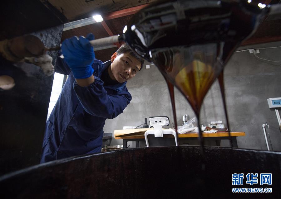 1月15日,吴荣强在龙泉市牛头岭村“七分醉”工作室滤漆。 新华社记者翁忻旸摄