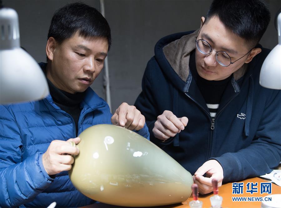 1月15日,龙泉青瓷艺术家杨盛侃(右)将一件有瑕疵的作品带到吴荣强的工作室,跟他讨论漆缮修复的细节。 新华社记者翁忻旸摄