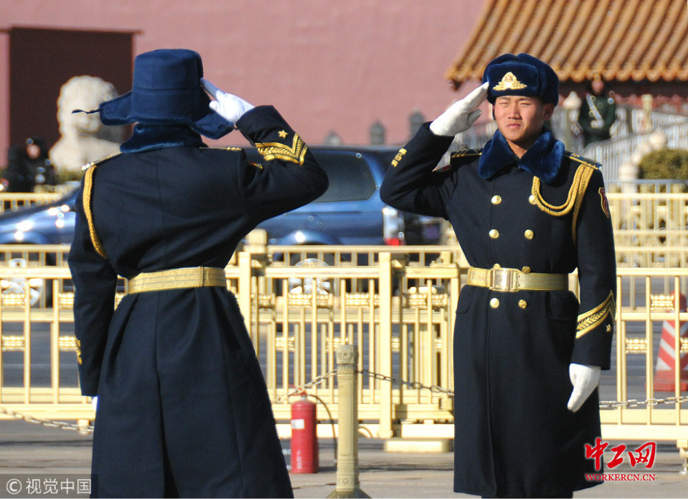 北京大风气温骤降 解放军顶寒风在天安门站岗执勤