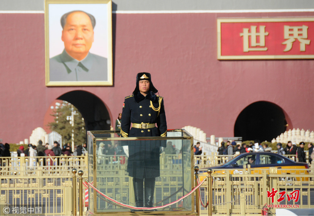 北京大风气温骤降 解放军顶寒风在天安门站岗执勤