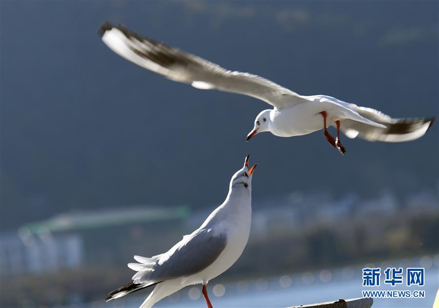 两只红嘴鸥在昆明滇池海埂大坝嬉戏(1月11日摄)。 入冬以来,数万只红嘴鸥飞临云南昆明翠湖公园、滇池海埂大坝等地,成为城市一道亮丽的风景。 新华社记者杨宗友摄