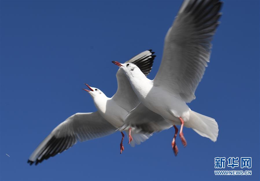两只红嘴鸥在昆明滇池海埂大坝上空飞舞(1月11日摄)。 入冬以来,数万只红嘴鸥飞临云南昆明翠湖公园、滇池海埂大坝等地,成为城市一道亮丽的风景。 新华社记者杨宗友摄