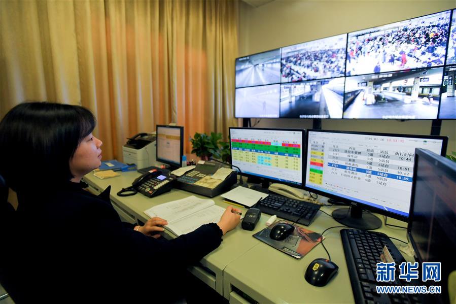 1月16日,工作人员在长沙火车站综控室工作。 春运临近,长沙火车站全面强化安检工作,提高服务水平,全力保障旅客平安顺利出行。 新华社发(陈泽国 摄)