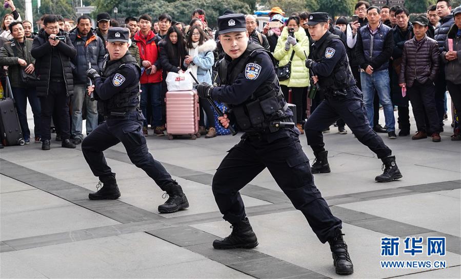 1月16日,旅客在观看民警技能演练。 当日,武汉铁路公安处在汉口火车站举行警营开放日活动,让旅客零距离接触警务安全工作,营造良好的春运出行环境。 新华社记者程敏摄