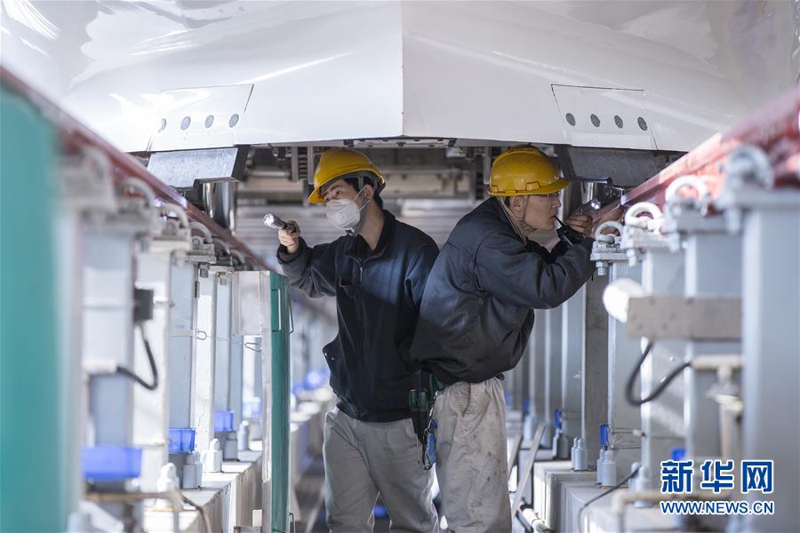 1月16日,西安动车段职工检查动车车轮驱动装置。 当日,中国铁路西安局集团有限公司西安动车段对配属的132组动车进行全面“体检”,以迎接即将到来的2019年春运。 新华社发(王曙天 摄)