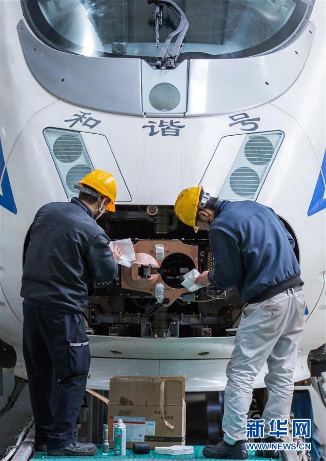 1月16日,西安动车段职工对动车车头连接装置进行检修。 当日,中国铁路西安局集团有限公司西安动车段对配属的132组动车进行全面“体检”,以迎接即将到来的2019年春运。 新华社发(王曙天 摄)