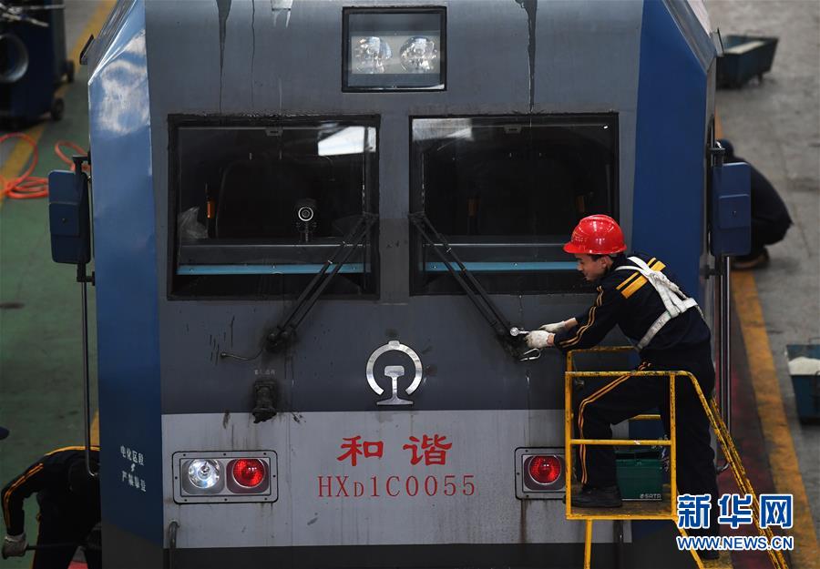 1月16日,重庆机务段职工在对机车雨刮器进行检修。 临近春运,为确保春运旅客和货物列车运输安全,中国铁路成都局集团有限公司重庆机务段对全段机车进行专项检查、整修,为即将到来的春运做准备。 新华社记者王全超摄
