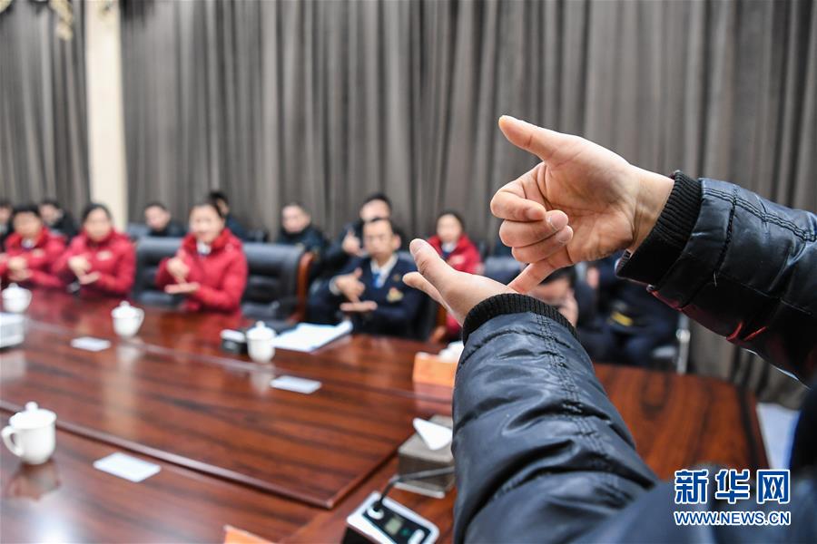 1月16日,中国铁路上海局集团有限公司苏州站职工在老师的指导下学习手语“乘”。 当日,中国铁路上海局集团有限公司苏州站联合苏州市盲聋学校共同举办“传手语、共融合”春运志愿服务技能培训活动,来自苏州站的30余名职工代表在活动中了解、学习基础手语技能,为即将到来的春运做准备。 新华社记者李博摄