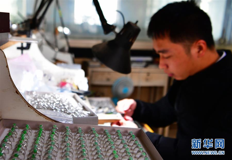 1月16日,在上塘村一家银饰珠宝城里,工人在制作翡翠戒指。
