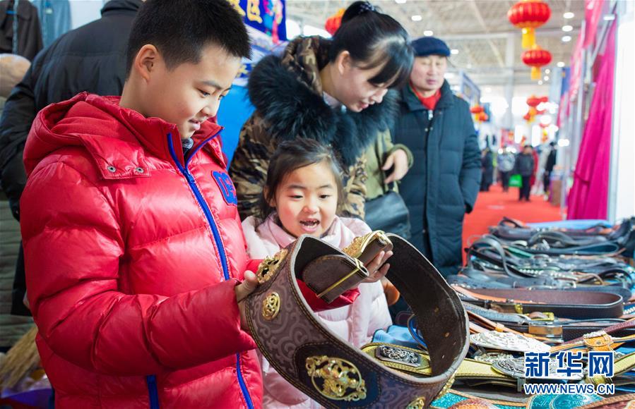 1月16日,两个小朋友在呼和浩特年货博览会上观看特色商品。 当日,2019第五届内蒙古呼和浩特年货博览会在内蒙古国际会展中心举行,国内外数百家企业参展,博览会设年货食品展区、酒类糖茶展区等六大展区,吸引众多市民前来采购年货。 新华社发(丁根厚 摄)