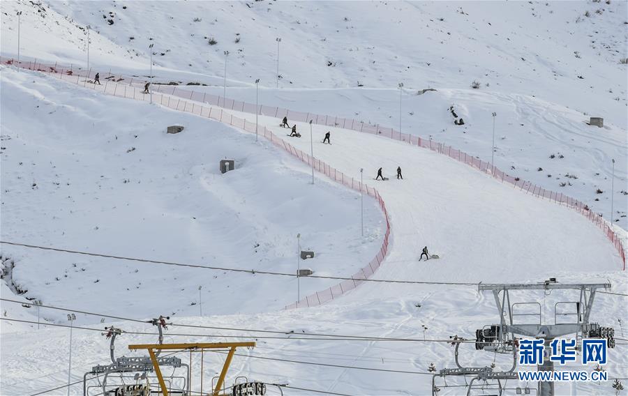 在新疆阿勒泰市汗德尕特乡墩德布拉克洞穴彩绘岩画附近,马马尼(前)和队友在滑下山坡(1月14日摄)。 新华社记者胡虎虎摄