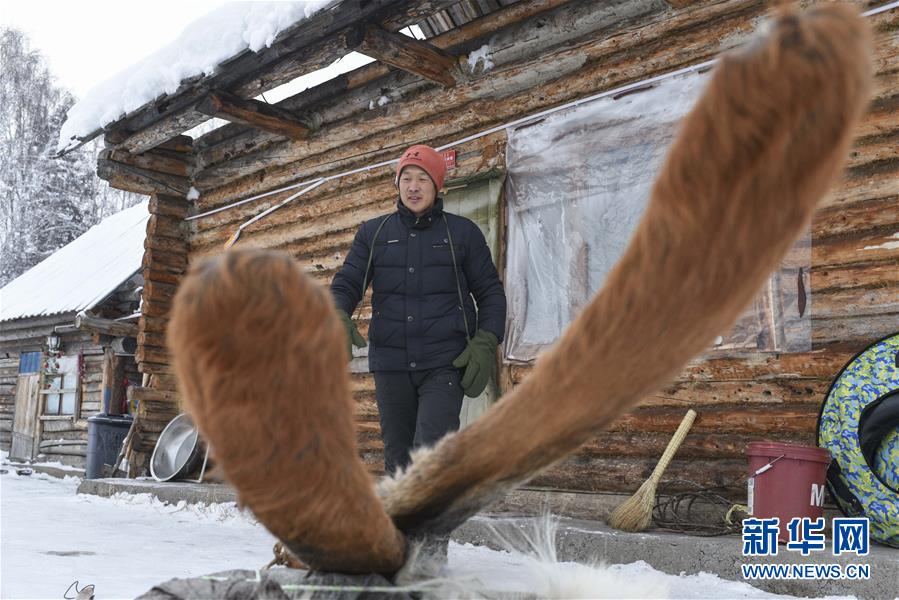 在新疆布尔津县禾木村的一处冬季牧场,马马尼(右)在离家参赛前一天为牲畜准备饲草料(1月3日摄)。 新华社记者胡虎虎摄
