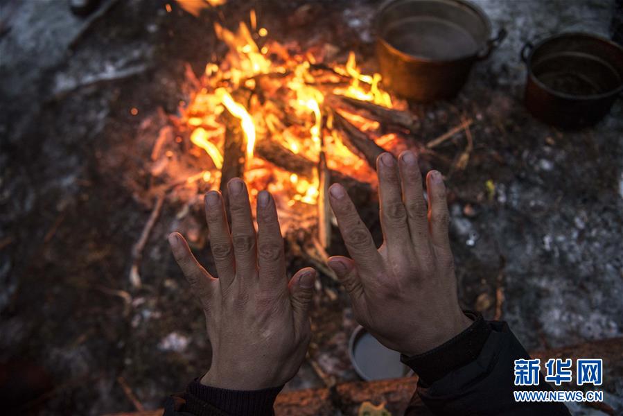 在翻越位于新疆喀纳斯景区观鱼台附近的一处山坡时,马马尼(右一)向身后的队友喊话(1月5日摄)。 新华社记者胡虎虎摄