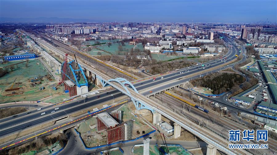 位于北京黄村的建设中的京雄城际铁路(2019年1月5日无人机拍摄)。