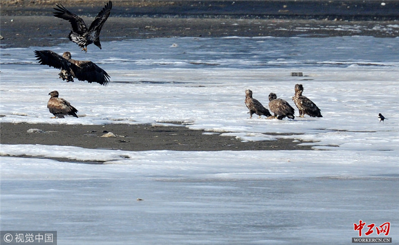 2019年1月16日,六只国家一级保护动物白尾海雕集体在渤海大连金州湾的海冰面上集中觅食,野鸭等禽鸟被海雕惊扰四处飞逃。