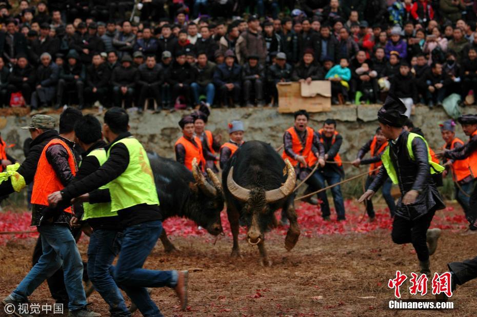 当日,来自黎平县的双江镇和从江县的丙妹镇、下江镇、高增乡、谷坪乡等乡镇村寨的苗族、侗族同胞牵来18头斗牛参战助威。图片来源:视觉中国