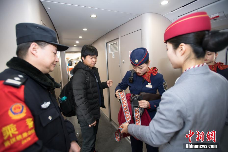 乘警长吴云峰(左)和列车长熊艳(右二)在高铁上,发现旅客遗忘的行李并及时归还旅客。赵军 摄