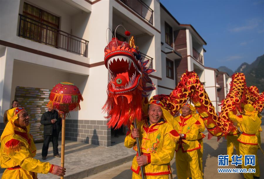 1月17日,宣恩县沙道沟镇白水易地扶贫搬迁安置点的居民参加舞龙灯活动。 春节临近,湖北省恩施土家族苗族自治州宣恩县沙道沟镇白水易地扶贫搬迁安置点的居民敲锣鼓、舞龙灯,喜迎搬迁后的第一个春节。 新华社发(王俊 摄)