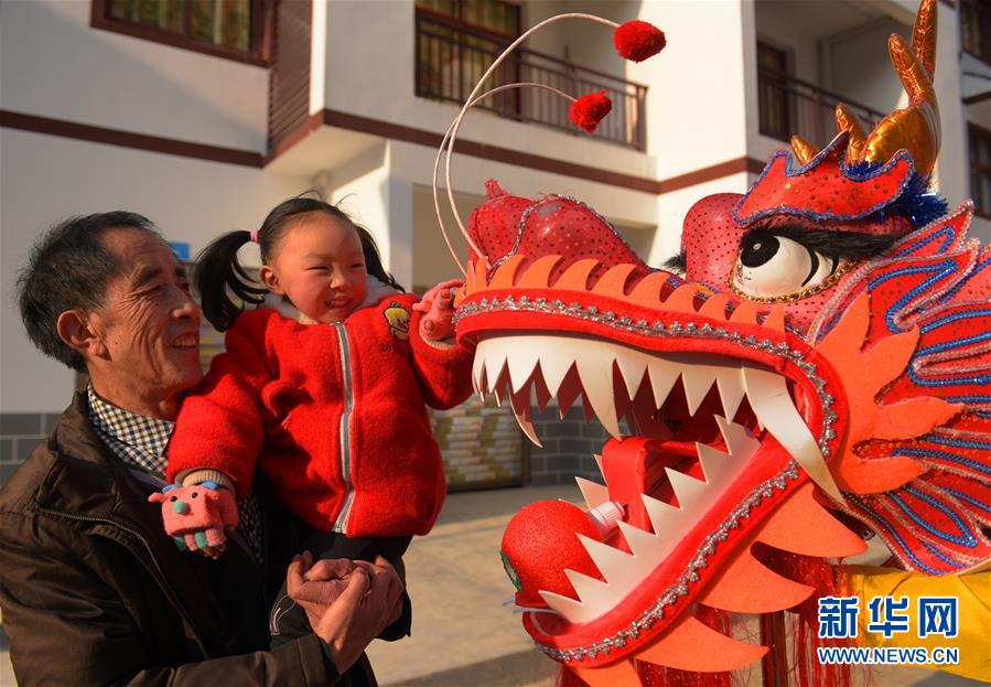 1月17日,宣恩县沙道沟镇白水易地扶贫搬迁安置点的一名小朋友在触摸龙灯。 春节临近,湖北省恩施土家族苗族自治州宣恩县沙道沟镇白水易地扶贫搬迁安置点的居民敲锣鼓、舞龙灯,喜迎搬迁后的第一个春节。 新华社发(王俊 摄)