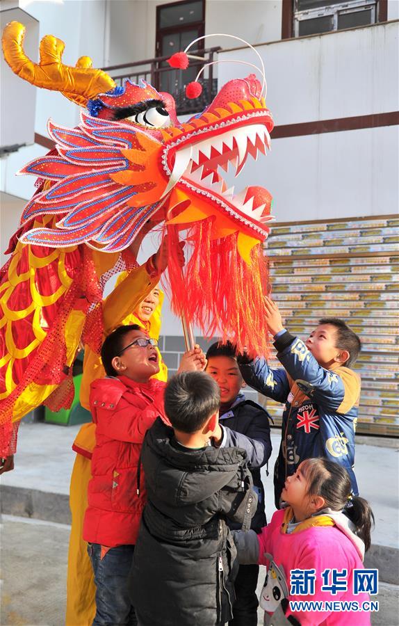 1月17日,宣恩县沙道沟镇白水易地扶贫搬迁安置点的小朋友在龙灯下嬉戏。 春节临近,湖北省恩施土家族苗族自治州宣恩县沙道沟镇白水易地扶贫搬迁安置点的居民敲锣鼓、舞龙灯,喜迎搬迁后的第一个春节。 新华社发(孟英豪 摄)