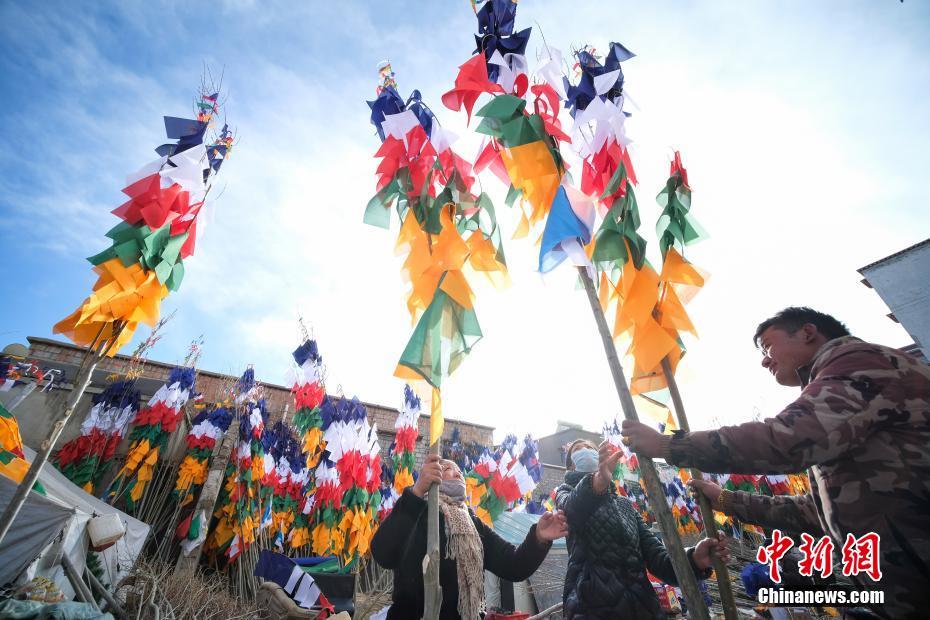 1月19日,拉萨市民正在挑选购买五彩经幡树。五彩经幡树是藏族民众在藏历新年前必备的年货之一。藏历新年期间,藏族民众每家每户会选择一个良辰吉日,为自家的房顶更换五彩经幡树,祈求新的一年里五谷丰登,吉祥如意。中新社记者 何蓬磊 摄