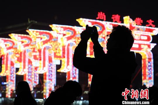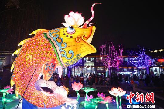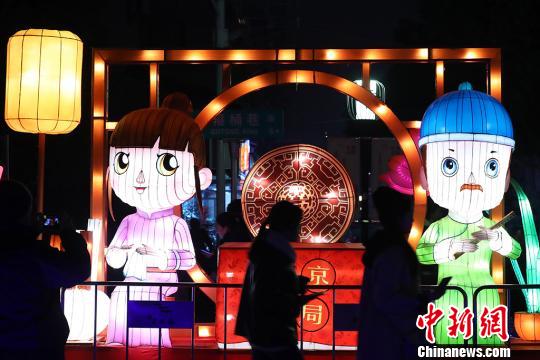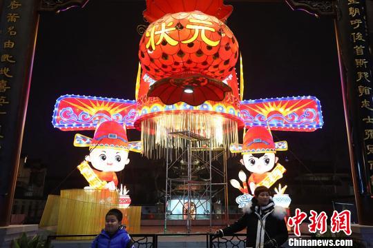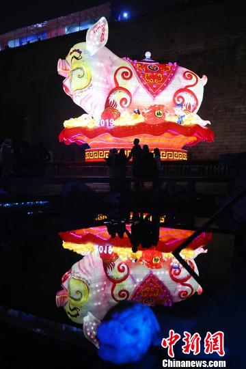 1月19日晚,南京门东老街上布置的巨型猪灯试亮。随着春节临近,南京城南夫子庙、门东老街一带安装好的大型灯组、各式彩灯陆续试灯,为节日“盛装打扮”。