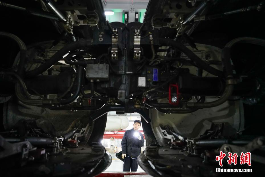 1月19日晚,一名动车机械师对动车进行检修。当晚,中国铁路成都局集团有限公司贵阳车辆段贵阳北动车运用所内灯火通明,一片繁忙景象。春运临近,贵阳北动车运用所300余名员工值守夜间,对配属的动车组进行检修维护。中新社记者 贺俊怡 摄