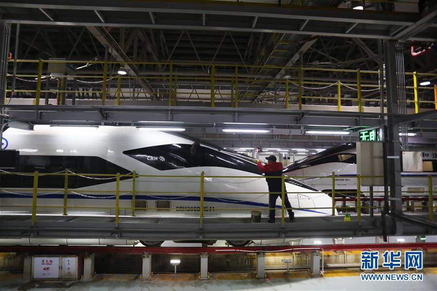 1月19日晚,保洁人员在贵阳北动车运用所清洗动车。