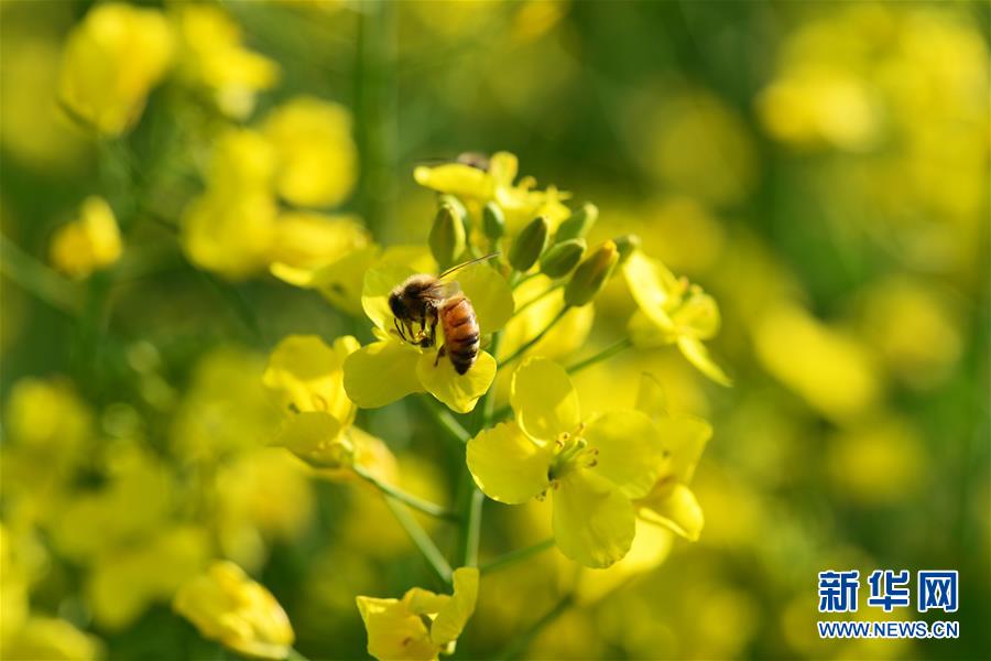 1月19日,一只蜜蜂在罗平县的油菜花田里采蜜。