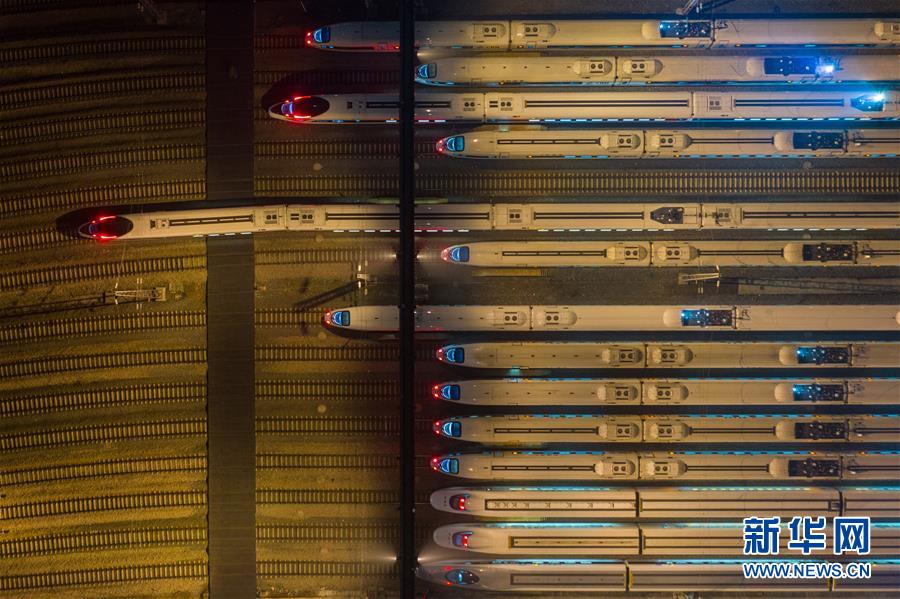 1月20日凌晨,动车组列车停靠在南京南动车所存车线上(无人机拍摄)。