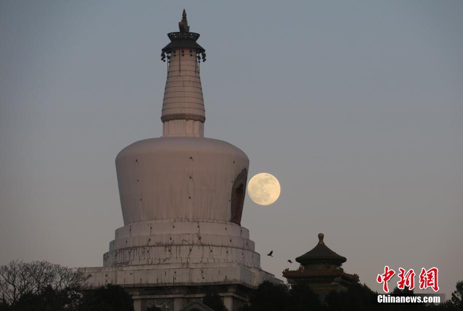 1月20日正值农历腊月十五,2019年第一轮圆月与北京北海公园内的白塔及古建筑相映成趣。 中新社记者 孙自法 摄