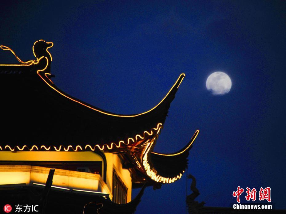 2019年1月20日晚,上海皓月当空,在云层中时隐时现,又宛若彩云追月。在豫园古建筑的辉映下,更觉美不胜收。 图片来源:东方IC 版权作品 请勿转载