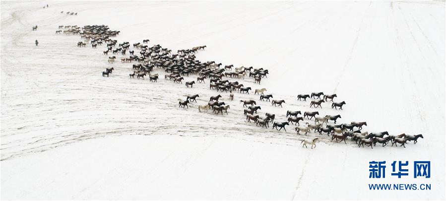 1月20日在山丹马场鸾鸟湖旁拍摄的马群(无人机拍摄)。