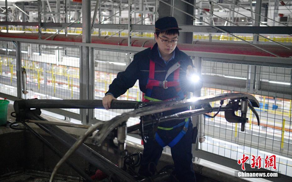 1月20日,四川成都,动车组机械师正在动车车顶检修受电弓。当日,中国铁路成都局集团有限公司成都动车段成都东动车运用车间内,100余名动车组机械师对投入春运的所有动车组展开检修和维护,迎接为期40天的2019年春运。中新社记者 刘忠俊 摄