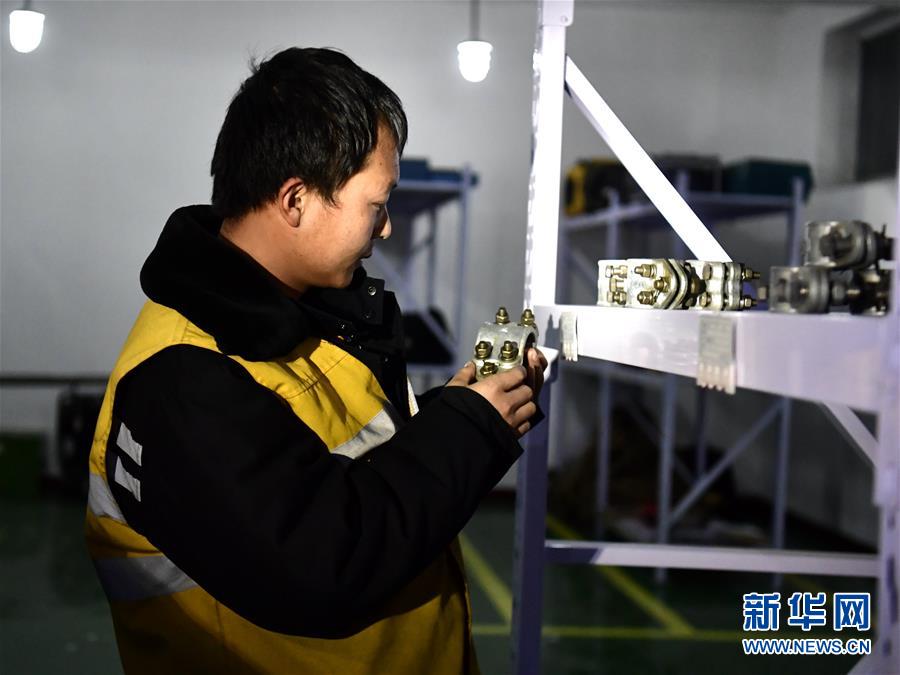 1月20日,接触网工蒋潇在准备将要更换的零件。 新华社发(张龙 摄)