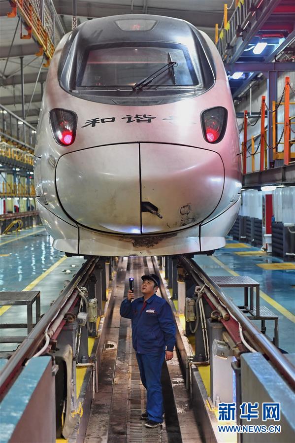 1月21日,赵海洲检查动车底部。 新华社记者 张楠 摄