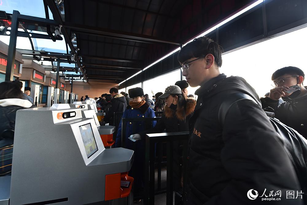 1月21日,北京站,旅客通过刷脸进站。(人民网记者 翁奇羽 摄)
