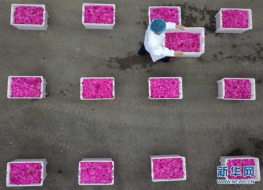 2018年4月21日,在贵州省镇远县青溪镇一家以鲜花为原料酿酒的企业,工人在搬运玫瑰花(无人机拍摄)。