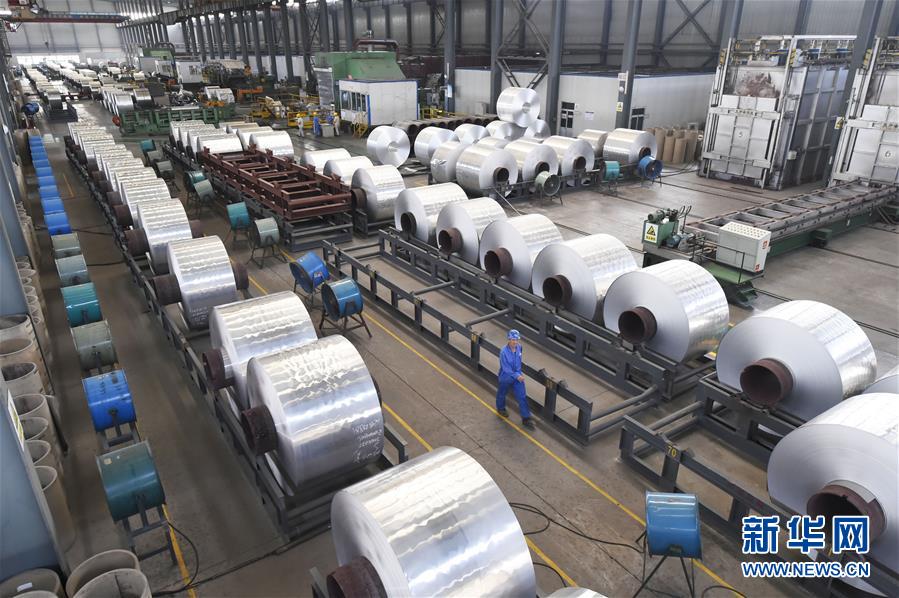 山东邹平一家铝业公司工人在车间内忙碌(2018年9月13日摄)。