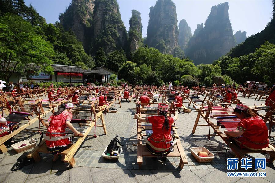 2018年6月7日,在湖南张家界武陵源风景区,居民在进行土家族织锦技艺展示。