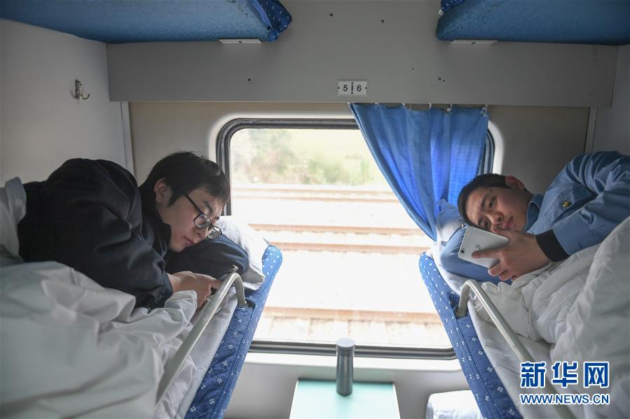 1月21日,李长安(左)被抽调到加开的K4186次列车上,趁着调班休息回复手机上的消息。新华社记者宋为伟摄