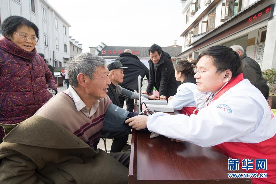 1月21日,志愿者在诸暨市东白湖镇陈蔡村免费为村民提供医疗服务。 为激活各类优质资源,实现便民服务,浙江省诸暨市自2018年起累计成立7个便民志愿者联盟,整合医疗、维修、书画、金融等服务内容,推动便民服务方式从“单打独斗”走向“抱团发展”。 新华社记者翁忻旸摄