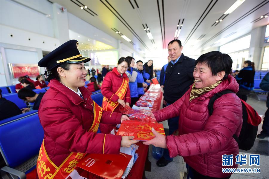 1月21日,在山东烟台火车站,工作人员给旅客送福字。 当日,2019年春运正式启动。 新华社发(初阳 摄)