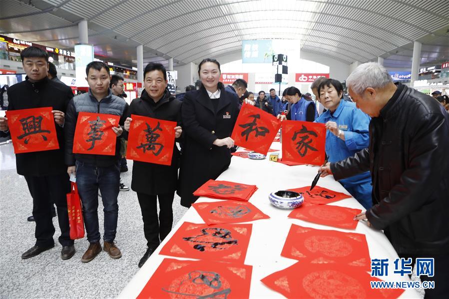1月21日,在山东济南西站,车站职工和旅客手举“家和万事兴”的书法作品合影留念。 当日,2019年春运正式启动。 新华社发(王峰 摄)