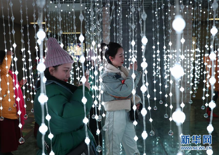 1月21日,在自贡彩灯公园,观众在灯珠中感受其科技元素。 新华社记者 江宏景 摄