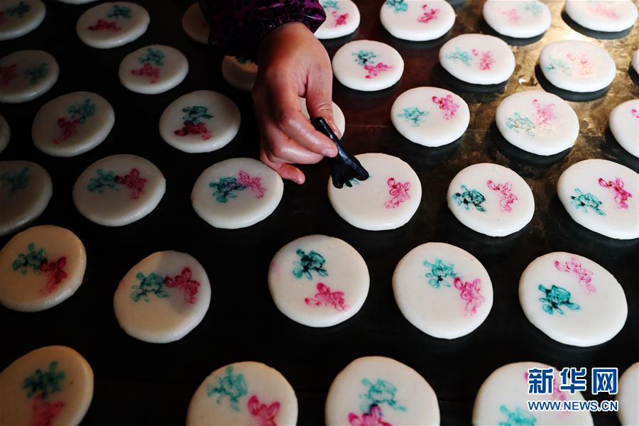 1月21日,重庆市黔江区马喇镇印合村村民莫露给糯米糍粑印花。 新华社发(杨敏 摄)