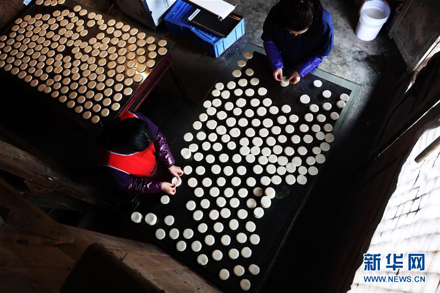 1月21日,重庆市黔江区马喇镇印合村村民莫露(左)、莫珊分拣糯米糍粑。 新华社发(杨敏 摄)