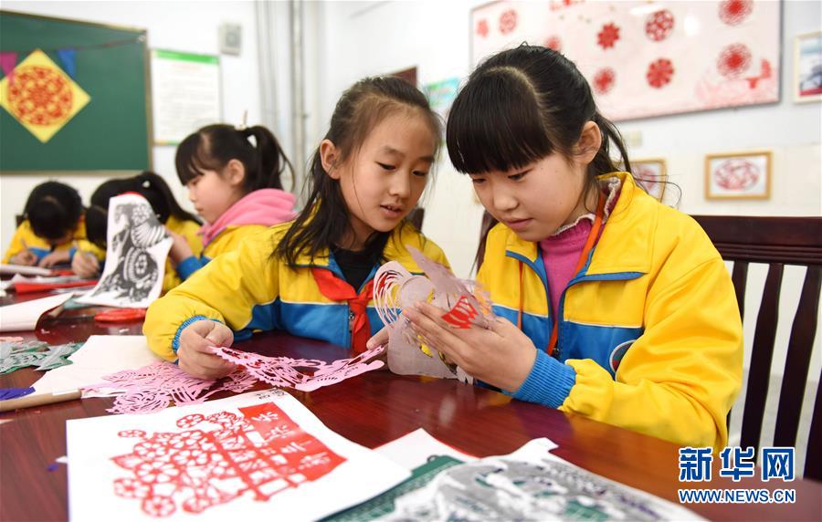 1月22日,南和县新区小学学生在练习剪纸。 新华社记者 朱旭东 摄