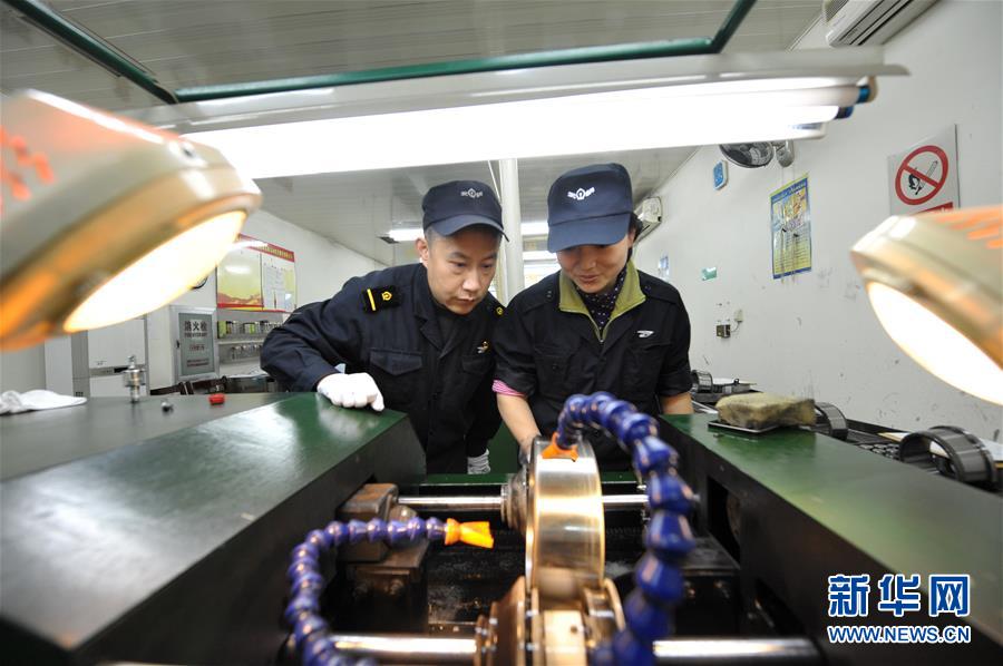 1月22日,质检员汪召坤(左)对火车车轮轴承进行检修。 新华社发(彭琦 摄)